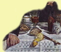 Gegenständen stillebenartig gedeckt. Reste vom eben erst beendeten