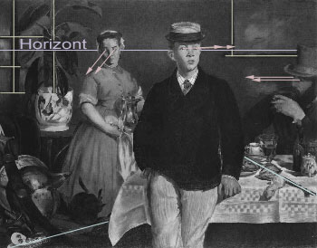 des Jungen. Die Raumillusion erreicht Manet damit, daß die im Hintergrund stehenden Dinge und Personen verschwimmen, wie beim fotografischen Effekt der begrenzten Schärfentiefe. Somit bildet er eine Distanz zwischen den Personen aus. Das Gesicht des Jungen steht im Vordergrund und ist detailiert und sehr gut zu erkennen. Die Personen sind hintereinander aufgereiht und bilden etwas kulissenhaftes auf engem Raum. Es wirkt alles wie ein Bühnenbild für den monumental, fast in Bildmitte aufgestellten Jungen. Ein Horizont, oder Linien die zu einem Fluchtpunkt führen, sind in diesem Bild von keinem geometrischen Gegenstand beschrieben. Der Blick kann sich