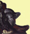 Helm, der Arm der Bediensteten und die Katze, die wirklich fast kreisrund