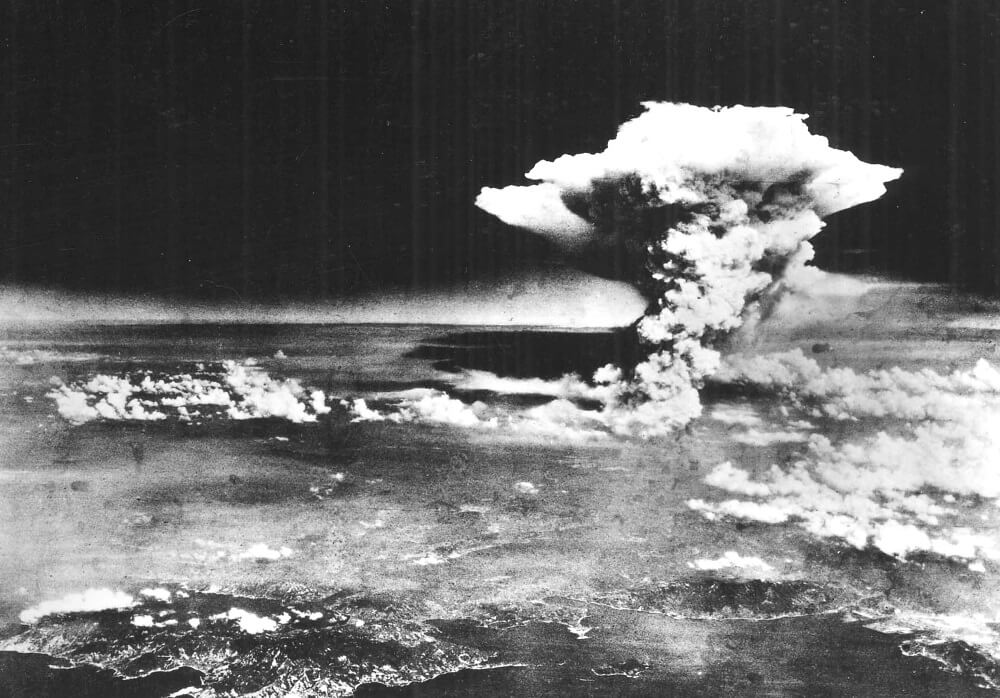 Flugzeugaufnahme der Explosion der Atombombe über Hiroshima am 6. August 1945 | Vollständiges Bild und Bildnachweis (Public Domain, Wikimedia): Bild anklicken