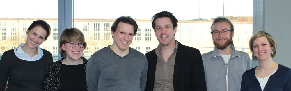 Das segu-Team (v.l.n.r.): Elisabeth Leng (2013-2016) – Lisa Philippen (2011-2013) – Johannes Jansen (2013-2014) – Christoph Pallaske (2011-2017) – Simon Grigo (2016-2017) – Astrid Wegner (2011-2014) | Aufnahme vom November 2016 – nicht auf dem Bild: Sabine Braun (2014-2016) | Foto: Projektabschluss-Feier | 25. Januar 2017 an der Universität zu Köln | Bildnachweis: CC0