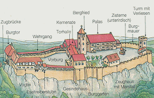 Das häusliche Leben der Ritter, der Minnesänger, der adligen Frauen spielte sich in der Burg ab. Man hatte seit dem 9./10. Jh. solche Burgen gebaut, und zwar zum Schutz vor Feinden. Das Recht zum Burgenbau war ein Vorrecht des Königs, der es jedoch an seine Getreuen weiterverlieh. So bauten auch Fürsten und Grafen, Bischöfe und Äbte eigene Burgen. Seit dem 11. Jh. entstanden Tausende solcher Burgen in ganz Europa, allein in Deutschland rund 10 000. In der Ritterzeit ließen Burgherren ihre "Wehrbauten" künstlerisch ausgestalten, so dass manche Burgen architektonische Kunstwerke darstellen.