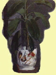 Die nachdenkliche, melancholische, gedämpfte Stimmung der Personen spiegelt sich in der Farbwahl wieder. Vor allem durch den dunklen Raumabschluss ( Wand ). Es entsteht durch diese Farbwahl eine gedämpfte Stimmung, aber auch eine Ruhe, die nicht nur über dunklen Ton erklärbar ist, sondern durchaus auch physisch zu begründen: Dunkle Töne tun dem Auge nicht weh, reizen es nicht. Man kann sie lange anschauen. Die hellen Akzente, die Licht von der rechten Seite her beschreiben, wirken etwas auffrischend in dieser melancholisch gedämpften Stimmung. Auch lenkt die Farbwahl den Blick des Betrachters in den Raum hinein, von der Lichtquelle her bis zum abschließenden Blumentopf. Dieser trägt erneut bei zur Auffrischung des Ganzen. Man könnte annehmen, daß er, als festes Dingsymbol sozusagen, die normal Situation beschreibt (das normale Leben, eine Pflanze verkörpert ja irgendwo auch das Leben), die, den bunten Farben nach zu urteilen, eher fröhlich ist, und läßt diese erstarrte Situation als Ausnahme erscheinen. |