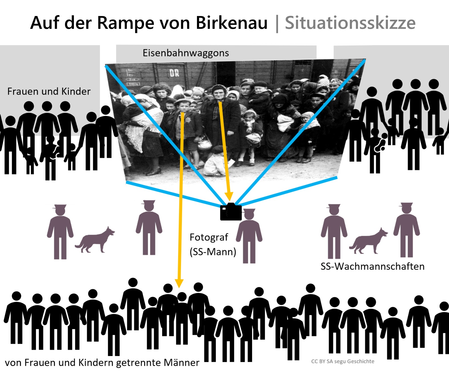 Unbekannter Fotograf (Angehöriger der SS-Wachmannschaften), Foto Nr. 12 aus dem Auschwitz-Album | Bildnachweis (Bundesarchiv Bild 183-N0827-318, KZ Auschwitz, Ankunft ungarischer Juden, CC BY-SA 3.0 DE, via Wikimedia): Bild anklicken