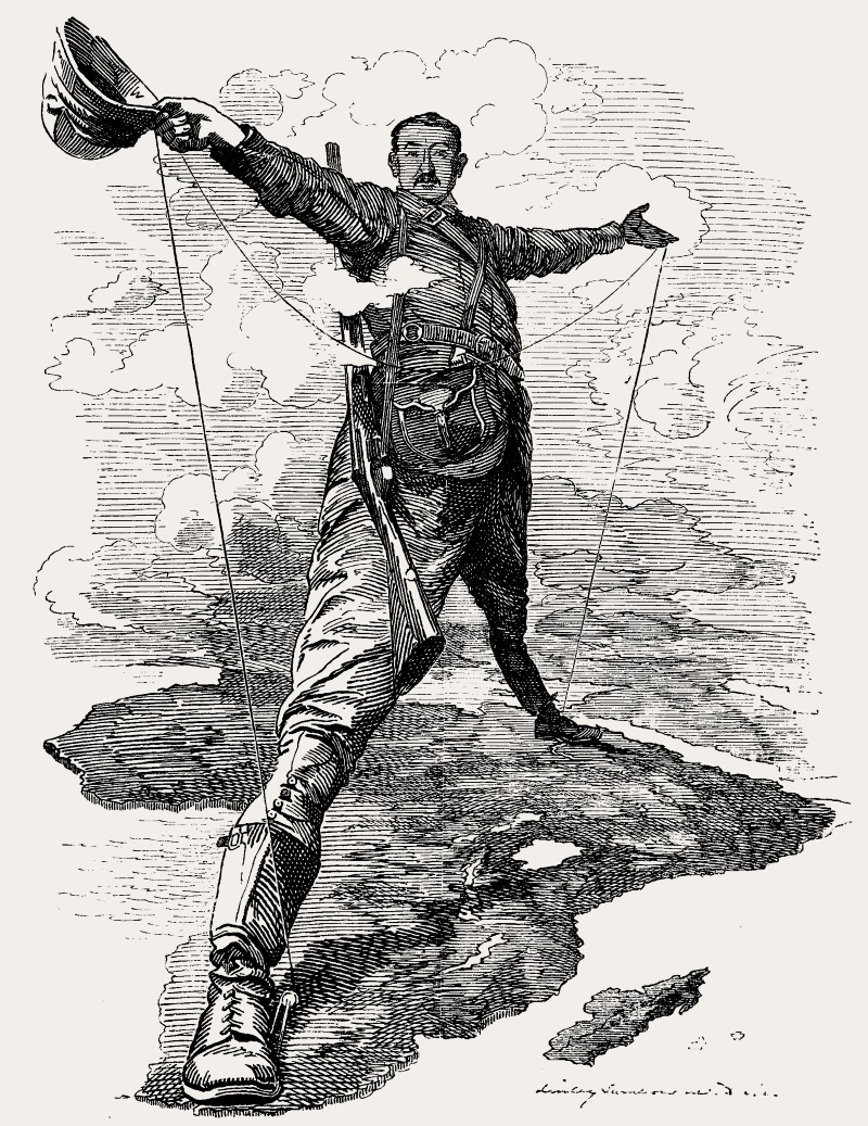 Cecil John Rhodes: The Rhodes Colossus, Karikatur (Ausschnitt) von 1892 (siehe Quelle 3) | Vollständiges Bild und Bildnachweis (Public Domain, Wikimedia Commons): Bild anklicken