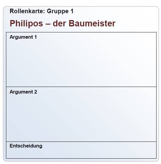1 | Eure Klasse wird in sechs Gruppen aufgeteilt – am besten zählt ihr einfach immer von 1 bis 6 durch. Dann sollt ihr euch in eurer Gruppe treffen und diskutieren, welche Argumente aus der Tabelle zu eurer Rolle passen. Trefft eine Entscheidung, ob ihr für oder gegen die Verbannung des Perikles seid. Um eure Argumente und die Entscheidung festzuhalten, sollt ihr eine Rollenkarte nach folgendem Schema anfertigen: