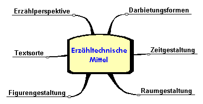 Die im Mind Map niederlegten Strukturbegriffe können zur Beschreibung, Analyse und Interpretation epischer Texte im Rahmen der schulischen Schreibformen zur Textinterpretation zugrunde gelegt werden. |